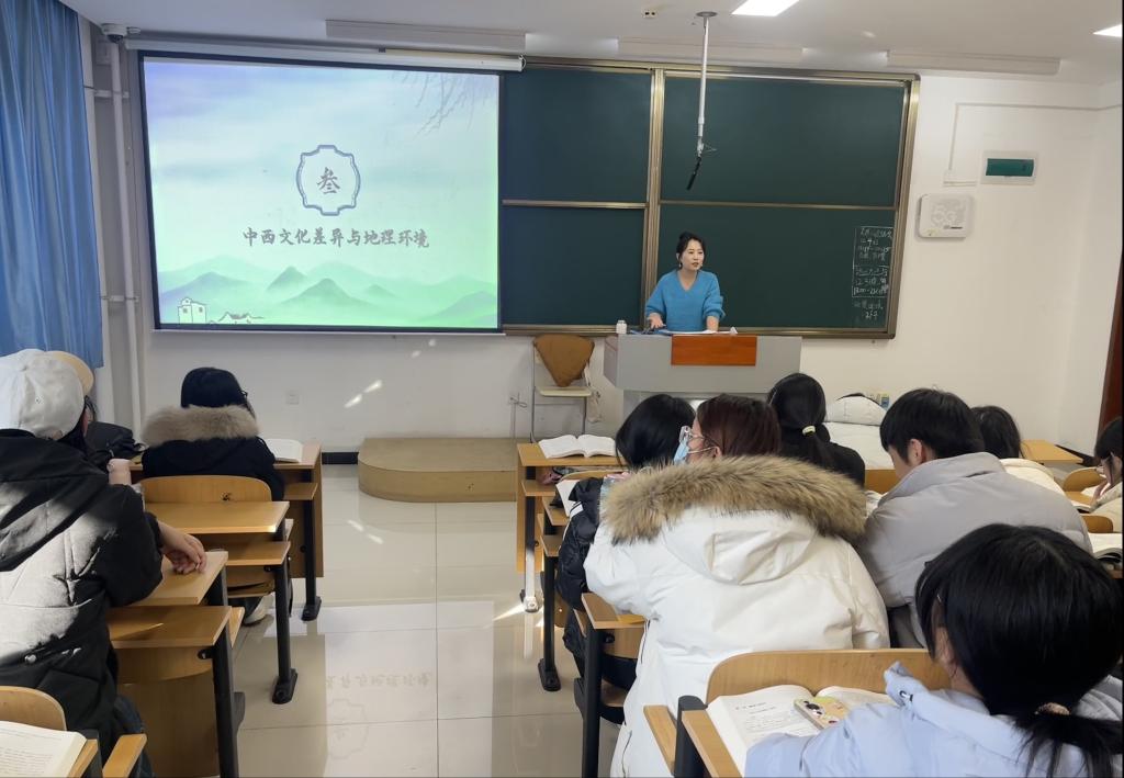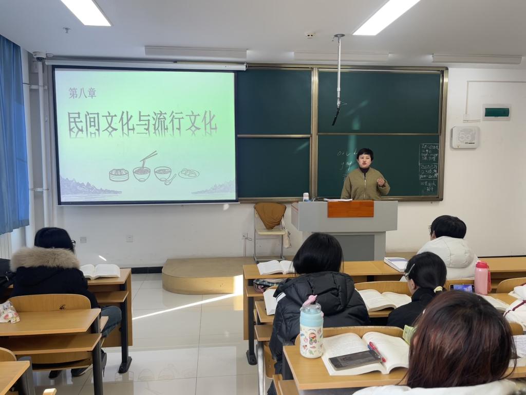 随后,李浩丹老师接过话题,向学生提问:“以上这些非遗形式具有什么共同特点?”在同学们积极思考并指出“多与农耕文化相关”后,李老师进一步从人文地理学的理论视角展开分析。她系统讲解了农耕文明与海洋文明的差异,并引导学生关注民间文化在全球化与数字化背景下向流行文化转化的动态过程。李老师以近年来中国文化通过短视频、文创产品、文旅融合等形式“出海”的案例,说明文化传播不仅跨越空间,更在当代媒介环境中被重新诠释与赋予新意。她指出,从民间到流行、从地方到全球,文化的流动始终伴随着地理空间的转换与意义的重构,这正是人文地理学关注“文化地理”与“空间过程”的意义所在。