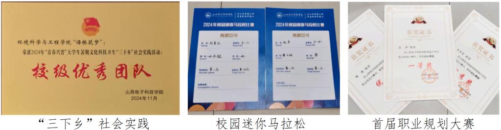 学院还积极响应社会实践活动的号召,积极参加活动,暑期“三下乡”社会实践活动中,师生奔赴乡村,围绕生态环境调研、生态农业助力乡村振兴等课题,运用专业知识为乡村发展出谋划策,获评“校级第六名优秀实践团队”。在学院自主打造的“感悟青春”百公里接力跑活动中,通过设置生态打卡、环保知识问答等环节,巧妙地将体育竞技与生态实践相融合,传递绿色生活理念。我院赵昱,赵紫辰同学于2024年校园迷你马拉松比赛中获得了第二的好成绩。在英国365集团公司首届职业规划大赛中我院有三位同学脱颖而出,分别获得了一个一等奖,两个优秀奖。在“临汾环境监测考察之旅”中,师生深入实验室学习监测知识,让专业学习扎根现实土壤。